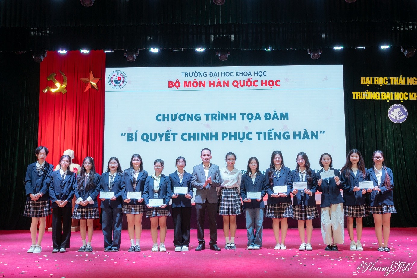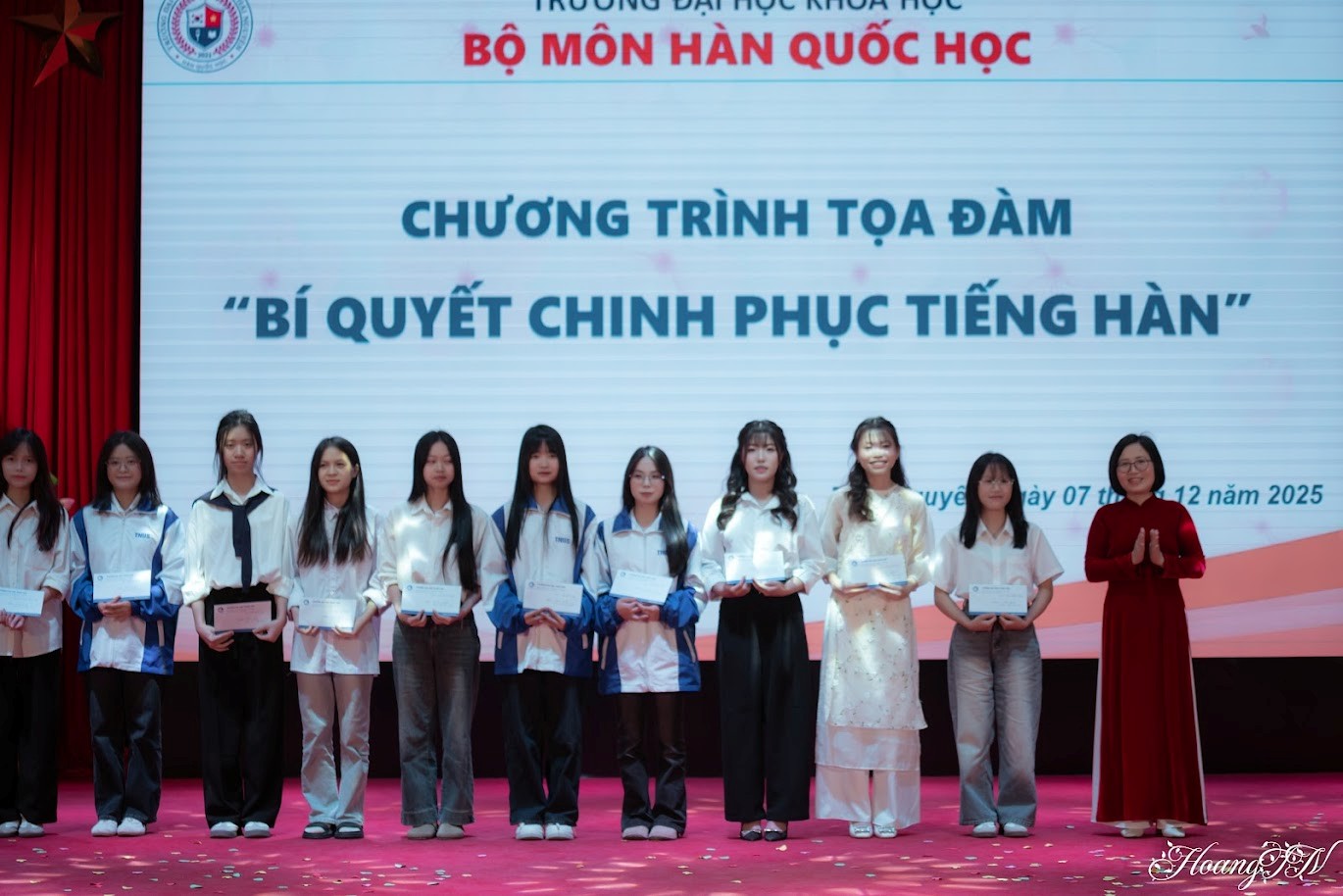 Để kịp thời động viên, khích lệ sinh viên tích cực học tập, nghiên cứu, rèn luyện, tại buổi Tọa đàm, Bộ môn Hàn Quốc học đã khen thưởng top 10 tân sinh viên khóa 23 có điểm tuyển sinh xuất sắc với tổng điểm 3 môn trong tổ hợp xét tuyển đạt từ 26,25 trở lên.
