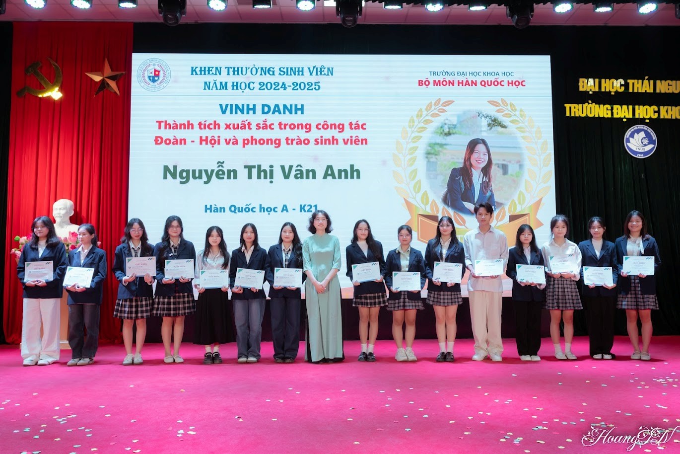 Năm học 2024 - 2025 đã khép lại với rất nhiều nỗ lực, cố gắng và những dấu ấn đáng tự hào của Bộ môn Hàn Quốc học. Bộ môn đã vinh danh, tặng giấy khen và thưởng cho sinh viên có nhiều thành tích và đóng góp cho phong trào học tập, nghiên cứu khoa học và phong trào sinh viên, cụ thể: