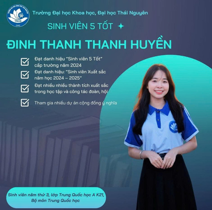 Đinh Thanh Thanh Huyền hiện là sinh viên lớp Trung Quốc học A K21 của Trường Đại học Khoa học, Đại học Thái Nguyên. Trong quá trình học tập và rèn luyện, em vinh dự được tập thể tín nhiệm giao đảm nhiệm vai trò Bí thư lớp; đồng thời là Chủ nhiệm Câu lạc bộ tình nguyện Hạnh Phúc Trao Tay trực thuộc Hội Sinh viên nhà trường. Bên cạnh đó, em còn là Ủy viên Ban Thư ký Hội Sinh viên Việt Nam của Trường Đại học Khoa học khóa VI, nhiệm kỳ 2023–2025.