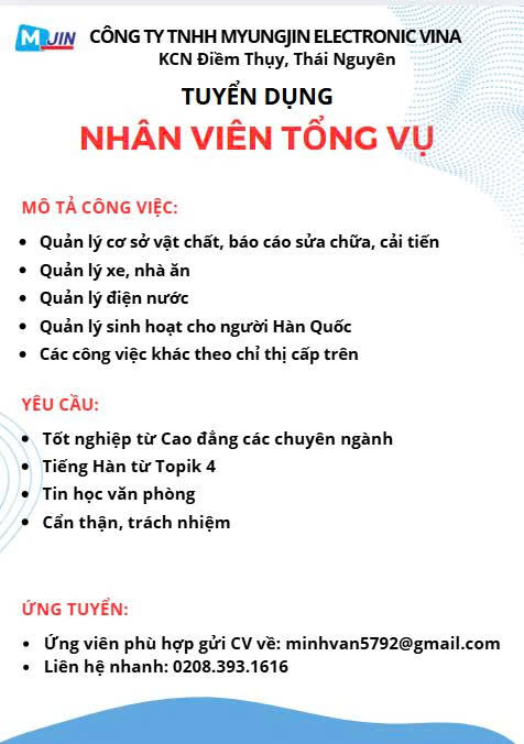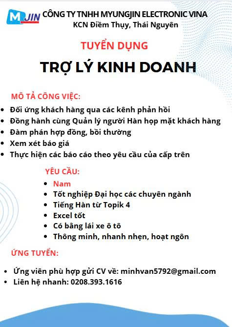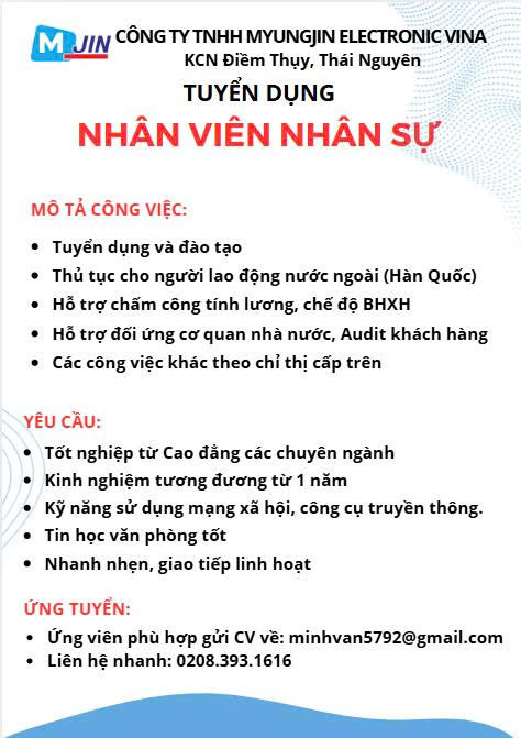 1. Công ty TNHH MYUNGJIN ELECTRONIC VINA KCN Điềm Thụy, Thái Nguyên