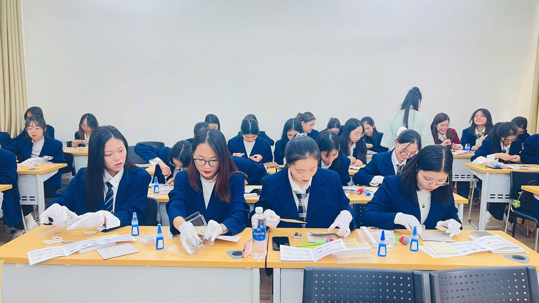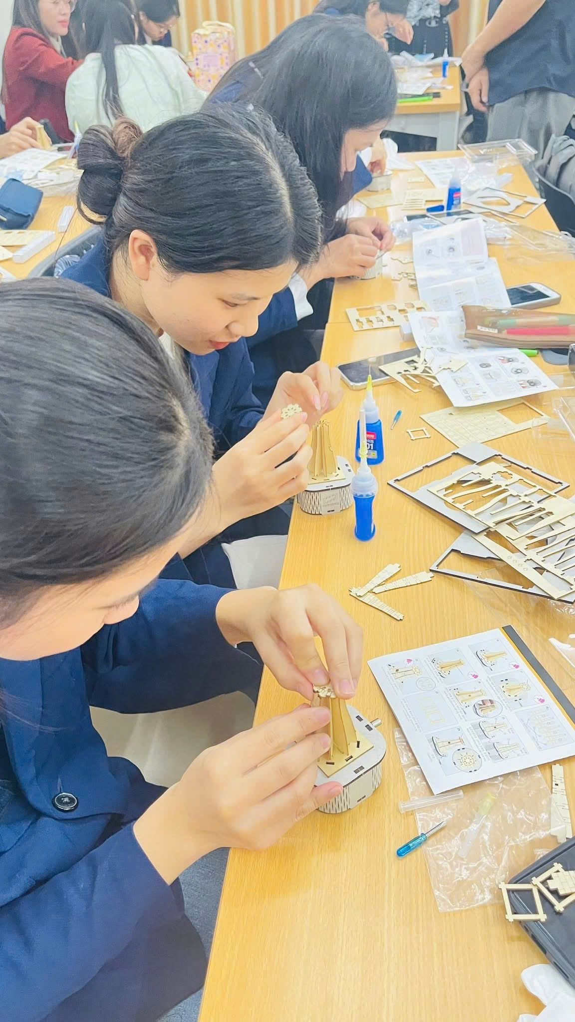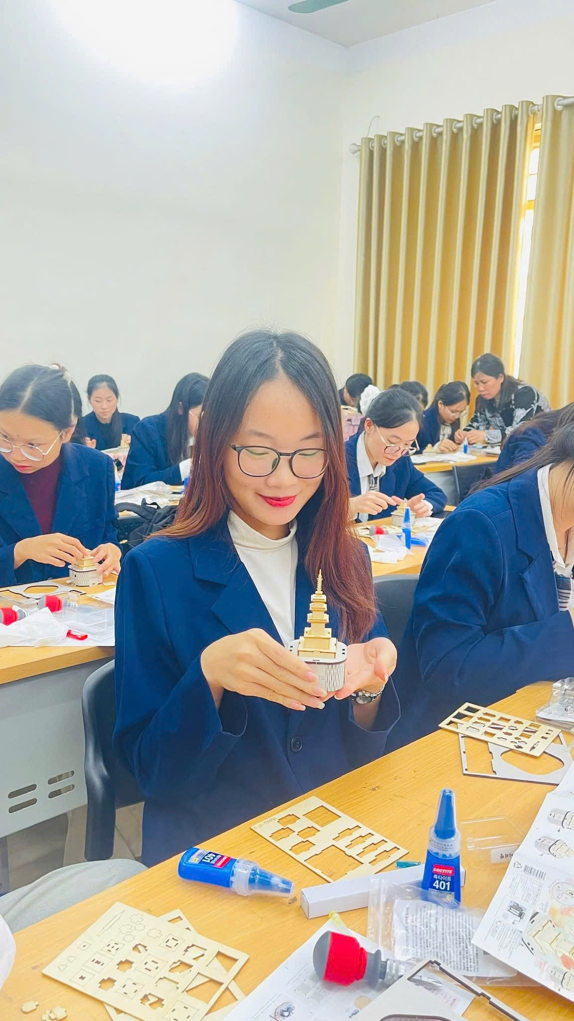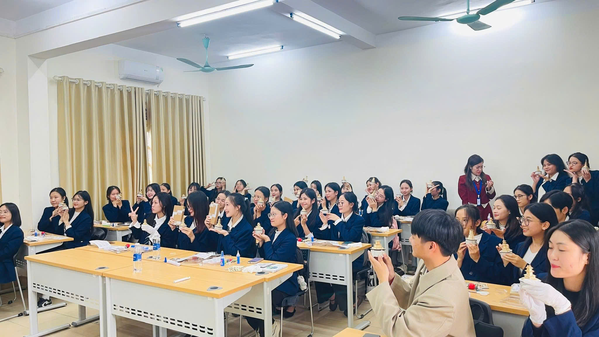 Đặc biệt, dưới sự hướng dẫn trực tiếp của ông Kwon Cheol Ho, sinh viên được trải nghiệm thực hành mô hình kiến trúc thời Tân La (Silla) - giai đoạn vàng son của văn hóa Hàn Quốc, với ba công trình tiêu biểu: Tháp Đa Bảo (다보탑), Tháp Thích Ca (석가탑) và Đài Thiên Văn (첨성대). Hoạt động trải nghiệm này đã khơi gợi sự hứng thú học tập và giúp sinh viên hiểu sâu hơn về mối liên hệ giữa văn học, kiến trúc và tư tưởng thẩm mỹ của Hàn Quốc cổ đại.